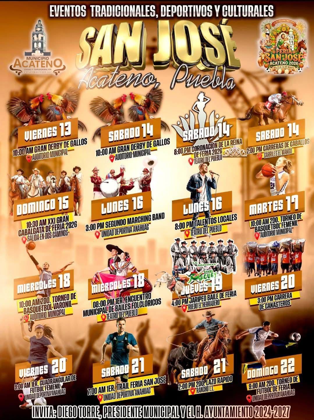 En un ambiente de entusiasmo y alegría, el Ayuntamiento de Acateno presentó oficialmente a las jóvenes que integrarán la corte real de la Feria San José Acateno 2026. A través de su plataforma oficial de gobierno, se anunció que la máxima celebración del municipio se desarrollará del 13 al 22 de marzo, teniendo como evento cumbre la solemne coronación de la reina el sábado 14 de marzo.